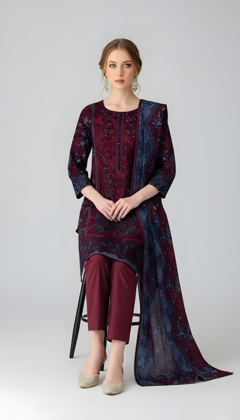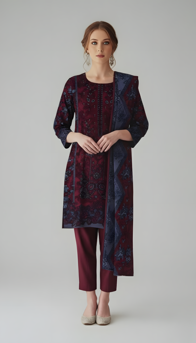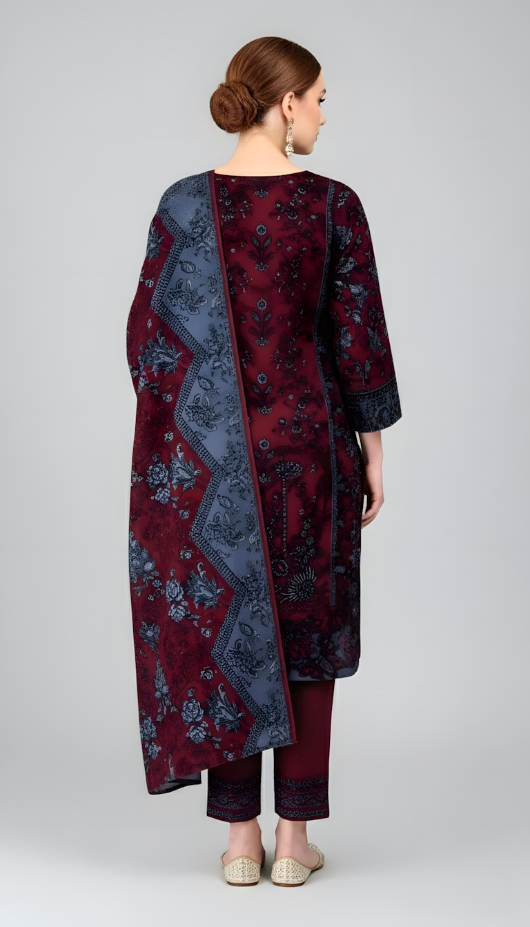 Style that speaks louder than words with this embroidered three-piece from the latest unstitched Winter Collection, crafted for vibrant style and effortless comfort.